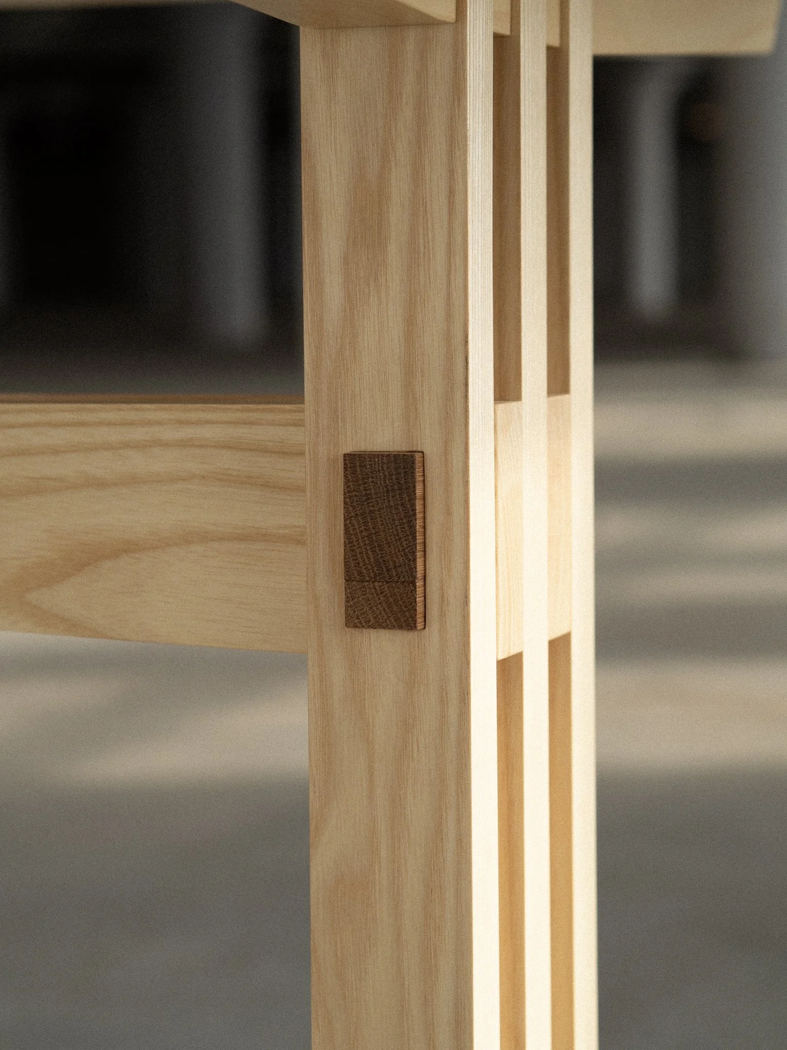 The two stretchers of the table are locked in place with white oak wedges. Since it’s a glueless joint, the wedges can be taken apart for disassembly, or further tightened to account for wood contraction in colder months of the year. The same applies to the oak pegs at the top sections of the base.