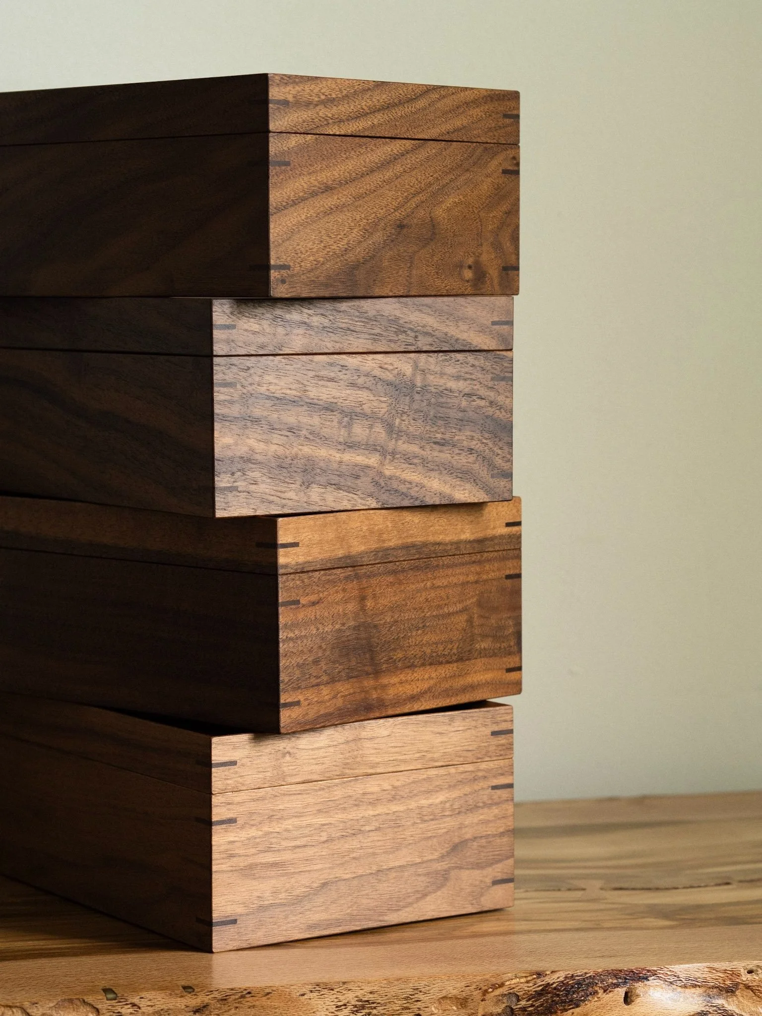 Despite uniform dimensions, each box has its own unique aesthetic provided by the varying grain patterns of the wood. Each corner is reinforced with wooden splines, providing strength as well as contrast to the entire form.