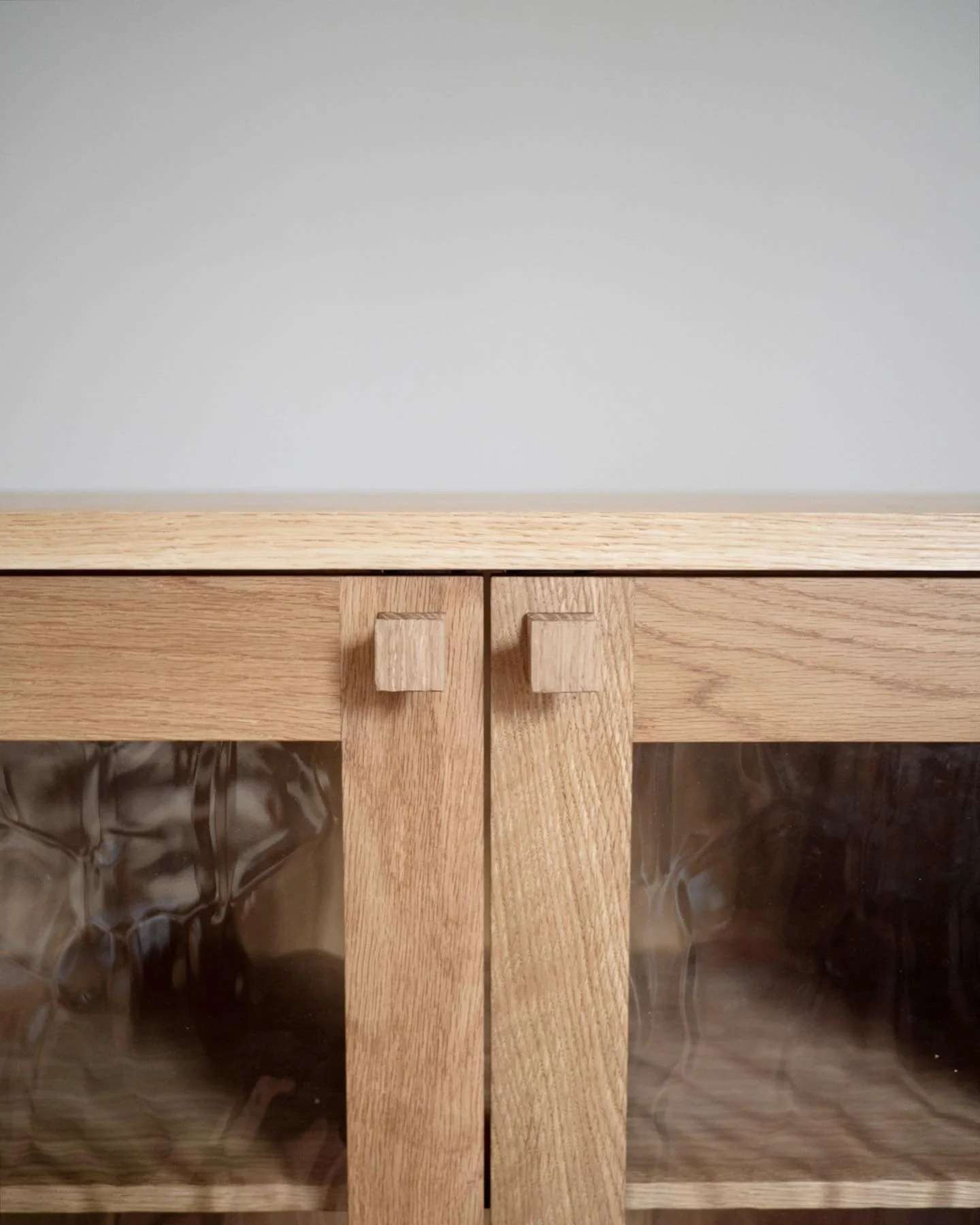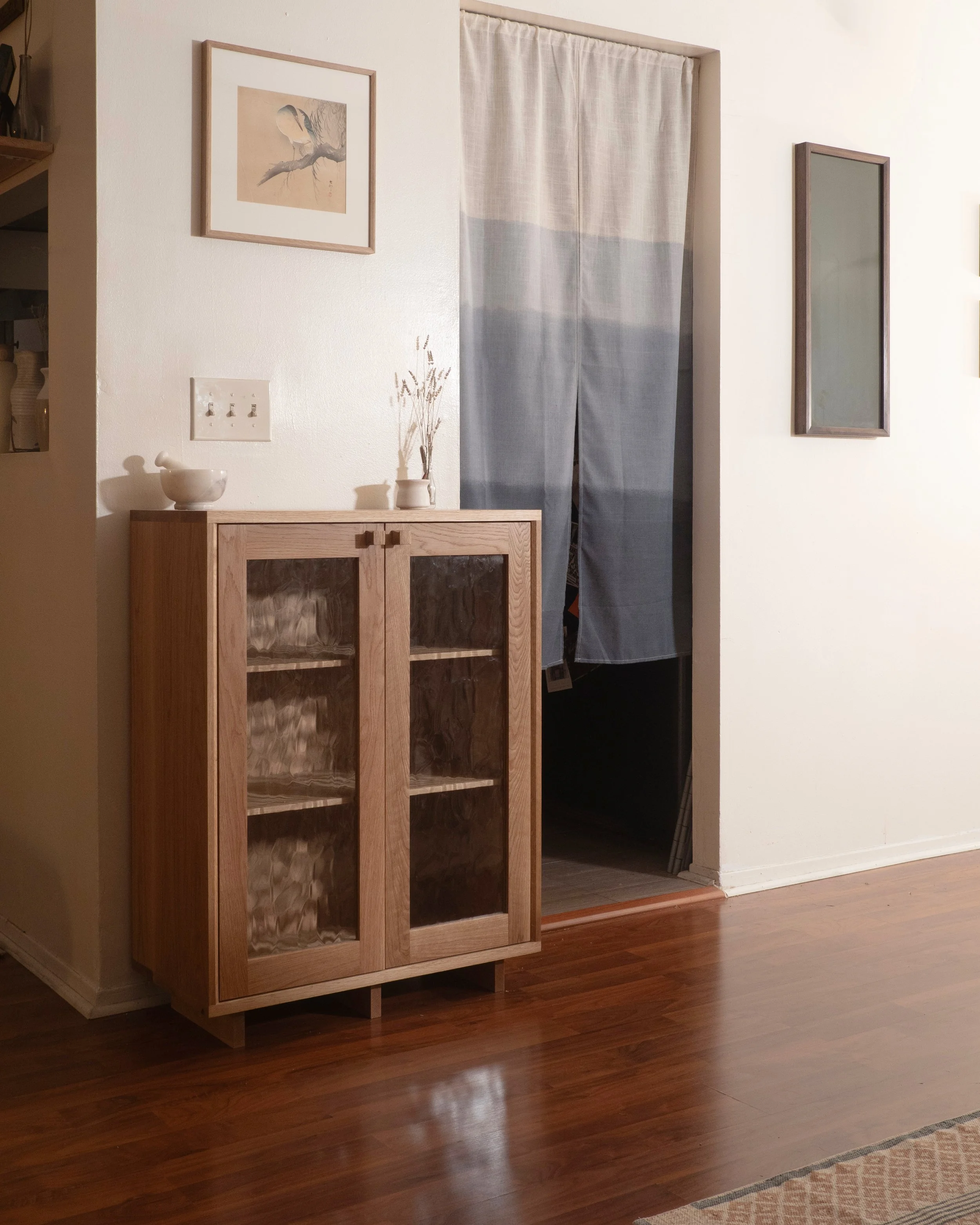 The Nami (“wave”) Cabinet features adjustable inner shelves, hand carved pulls, and wave-textured glass that creates cohesion amongst your stored valuables.